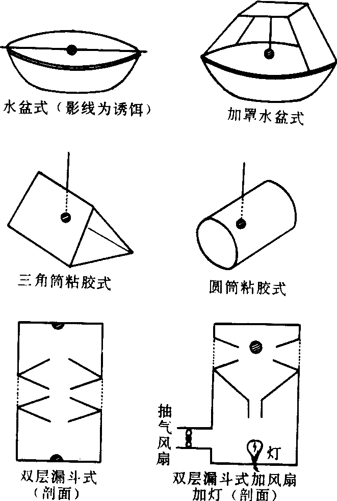 性诱器sex pheromones traps利用天然或人工合成的性外激素诱集同种异性昆虫的装置。用于害虫发生动态的预测预报,或作为害虫防治的辅助手段。 性诱方法 依据性外激素的来源,性诱方法可分:❶活体诱集法。一般是将未交配的昆虫,装在一个小铁纱笼中,悬挂在诱器上诱集异性; ❷粗提物诱集法。将羽化后未交配昆虫(如蛾类)的性外激素腺体部位腹部末端剪下,浸入有机溶剂中约12~24小时,滤取浸液滴在5×5厘米的滤纸上,趁未干时卷成纸筒,装在诱器上应用; ❸人工合成性诱剂诱集法。将人工合成性诱剂用多孔性材料吸收,封入塑料包或塑料管中,用时剪开即可。 性诱器 性诱器有多种形式,可根据不同种类的昆虫、不同应用目的、不同设置场所等,设计各种性诱器(见图): ❶水盆式:用水盆盛水,水中放少量洗衣粉以降低水的表面张力,将水盆放在田间适当地方,再将性诱物质或活虫分别装在诱器内,悬挂在水盆上距水面2厘米左右处,可引诱同种异性昆虫跌落水面。此种装置需防雨防晒,最好在盆上加覆盖物。 ❷粘胶式:将厚纸片或塑料片卷成圆筒形,筒的内壁涂粘胶,诱物吊在筒内,然后将筒悬挂在田间。 ❸漏斗式: 将诱物装在特制的诱集器中,这种诱器四周有孔或裂隙状漏斗,虫易进难出,有的诱器中还加有风扇吸气装置或诱虫灯光,可增加诱集效果。
