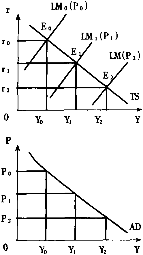 总需求曲线 总需求曲线aggregate demand curve反映总需求量与一般价格水平之间关系的曲线。一般来说,总需求曲线的形状是由左向右下方倾斜,曲线的斜率是负的。 在微观经济学中,单个商品的需求曲线向下倾斜有两个基本原因,即替代效应和收入效应。前者指一种商品价格上升导致购买者减少对这种商品的购买,而增加购买相对比较便宜的替代品; 后者指一种商品价格上升导致消费者的既定的货币收入只能购买较少量的这种商品。但这两种解释并不适于说明总需求曲线。因为总需求下降并不是一种商品价格上升导致商品之间替代的结果,而且价格水平的变化不仅意味着商品价格的变化,而且还意味着生产要素价格 (包括工资和薪水) 的变化,因此,价格水平的变化并不必然导致一般购买力的损失。 一般认为,总需求曲线向下倾斜产生于货币的利率效应和利率对总购买量的影响。当价格水平上升时,厂商需要更多的货币支付工资和购买生产要素,居民户需要更多的货币弥补额外的开支。在货币供给不变的情况下,这种需要会造成货币短缺。货币短缺又会引起利率上升。由于厂商的某些支出 (厂房和设备的投资) 和居民户的某些支出 (购买住房)对借款利率的上升是比较敏感的,因而希望减少他们的支出。这样,价格水平上升时,由于货币供给不变,利率上升,对产出的总需求量就要下降。图a是总需求曲线。 图a 总需求曲线 ☚ 总供给曲线 均衡国民收入水平 ☛ 总需求曲线 总需求曲线aggregate demand curve“总供给曲线”的对称。表明物品市场与货币市场同时达到均衡时价格水平与总需求之间关系的曲线。在附图中,横轴代表总产量(国民收入),纵轴代表价格水平,AD是总需求曲线。如图所示,总需求曲线是一条向右下方倾斜的曲线,即价格水平与总需求之间是反方向变动的。这是因为,根据凯恩斯主义的国民收入决定理论,在名义货币存量既定时,价格水平的下降会使实际货币存量增加。在货币需求不变的条件下,这就引起利率下降,由此导致投资需求增加,投资需求增加则引起总需求增加。反之,价格水平上升会使实际货币存量减少,利率上升,从而总需求减少。参见“总供给曲线”。