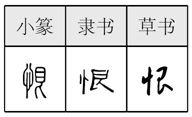 ❹ 旧仇新恨|离愁别恨|离情别恨|千愁万恨|千古遗恨|切齿痛恨|深仇大恨|新愁旧恨 恨 金文; 篆hèn[忄(心,意符)+艮(不順,聲意符)→恨(《説文》:“怨也,從心,艮聲。”不順心〈怨恨、仇恨〉。)] [唐] 白居易《長恨歌》:“天長地久有時盡,此恨綿綿無絶期。” [唐] 元稹《遣悲懷三首》:“誠知此恨人人有,貧賤夫妻百事哀。”(喪偶人所難免,患難夫妻更多一份哀情。) [宋] 王禹偁《點絳唇》:“雨恨雲愁,江南依舊稱佳麗。”(雖恨雨愁雲,江南風景依然佳麗。) 恨hèn(9画)