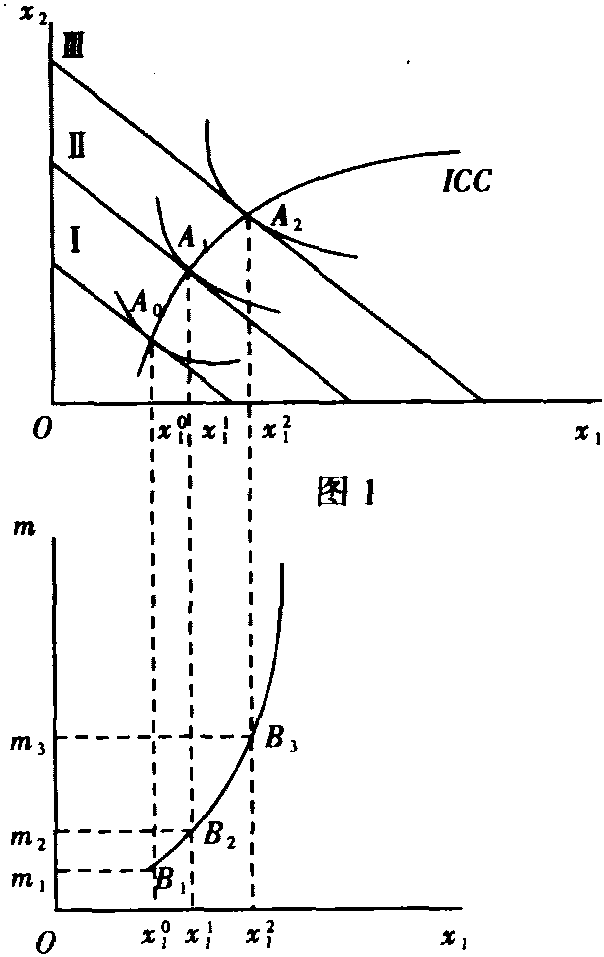 恩格尔曲线 恩格尔曲线Engel Curve描述货币收入水平同某一特定商品均衡购买量的关系的曲线,也可表示消费者对一种商品支出与其货币收入之间关系的曲线。它描述了恩格尔定律,故称。由于假定商品价格不变,消费支出与购买量呈固定比率,因此上述两种定义是一致的。该曲线可以由收入消费曲线 (ICC) 推导出来。在图1中表示两种商品x1和x2的情形。预算线Ⅰ、Ⅱ、Ⅲ分别对应于收入m1、m2、m3,它们与无差异曲线相切于A0(x10,x20)、A1(x11,x21)、A2(x12,x22),这样货币收入m1、m2、m3分别对应于商品x1的均衡购买量x10、x11、x12,反映到图2中,就形成商品x1的恩格尔曲线。曲线的形状取决于商品性质(正常商品还是劣等商品、必需商品还是奢侈商品)、消费者爱好以及商品的价格高低。图3中的恩格尔曲线是向右下方倾斜的,其需求收入弹性为负,表示劣等商品的恩格尔曲线。
