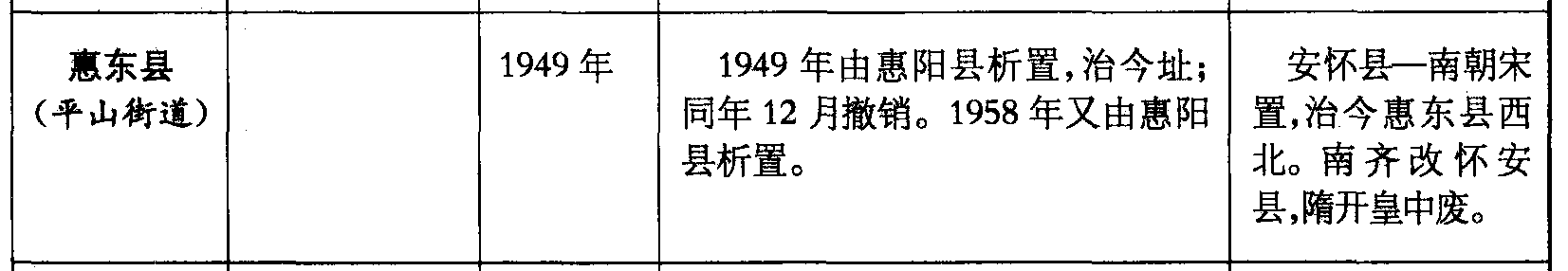 惠东县(平山街道)1949年1949年由惠阳县析置,治今址;同年12月撤销。1958年又由惠阳县析置。安怀县—南朝宋置,治今惠东县西北。南齐改怀安县,隋开皇中废。
