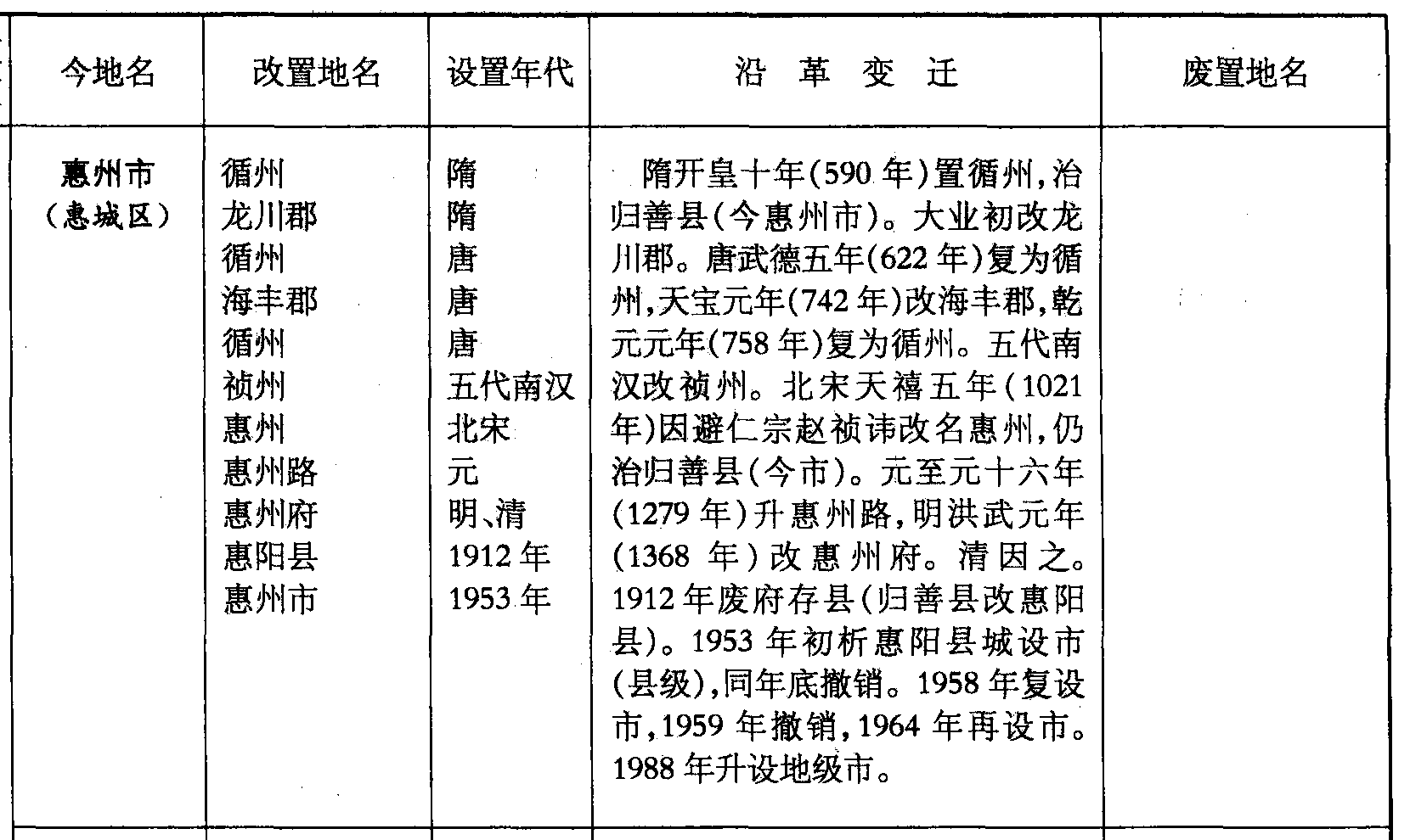 隋开皇十年(590年)置循州,治归善县(今惠州市)。大业初改龙川郡。唐武德五年(622年)复为循州,天宝元年(742年)改海丰郡,乾元元年(758年)复为循州。五代南汉改祯州。北宋天禧五年(1021年)因避仁宗赵祯讳改名惠州,仍治归善县(今市)。元至元十六年(1279年)升惠州路,明洪武元年(1368年)改惠州府。清因之。1912年废府存县(归善县改惠阳县)。1953年初析惠阳县城设市(县级),同年底撤销。1958年复设市,1959年撤销,1964年再设市。1988年升设地级市。