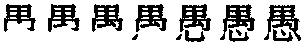 【提示】禺,9画,第七笔中间一竖穿过,第八笔是横,末笔是点,不要把第七、八笔连成一笔。禺第三笔的横,宋体与左右两边相接,楷体与左右两边相离。 *愚yú13画 心部 (1) 傻;笨: ~蠢|~笨|~昧|~不可及|大智若~。 (2) 欺骗;蒙蔽: ~弄|~民政策。 (3) 谦辞(称与自己有关的): ~见|~意|~兄|~以为。 愚 ☚ 愉 戇 ☛ 愚yú战国以来的形声字。从心,禺(yù,一种猴)声。傻,笨义。如:愚人|愚昧无知。组词如:愚蠢。转为动词,使愚蠢。如:愚民政策。又愚弄,欺骗,耍义。如:愚弄人|为人所愚。引申为谦词。如:愚见。 愚★常◎常