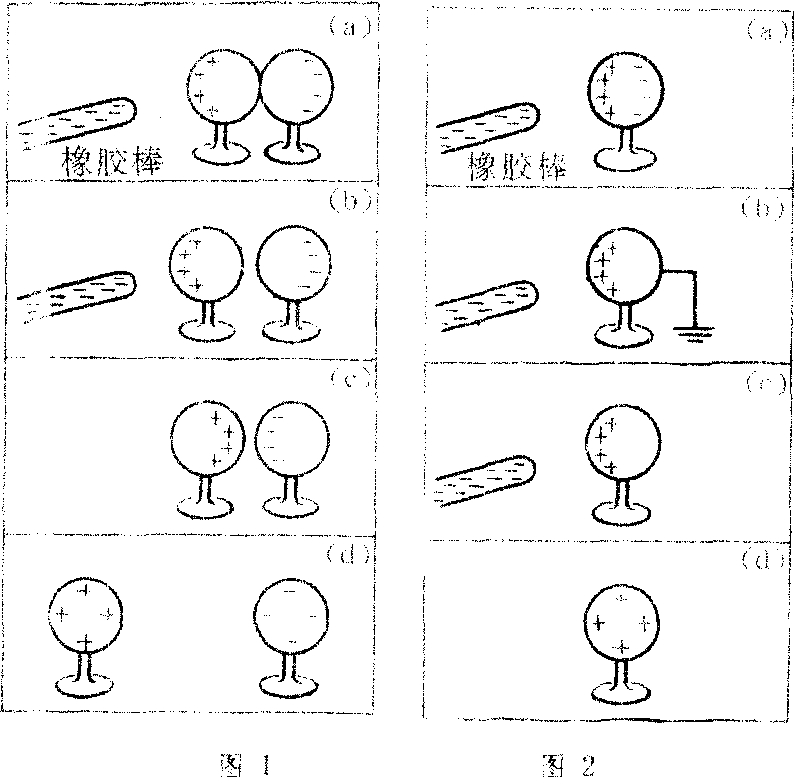 用静电感应的方法使物体带电的过程。图1为用感应方法使两个金属球带异号电荷。其方法是在施感电荷存在时将相挨的绝缘导体球A、B移开。图2为用感应方法使单个金属球带电,要点是在旋感电荷存在时将金属球接地,负电荷移入地中,断开接地导线,则金属球带与施感电荷异号的电荷。