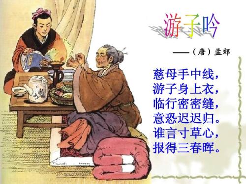 (五言古风短篇孟东野“游子吟”) 羁旅他乡的我,身上所穿的衣服,正是慈母亲手缝制的,一针一线充塞着温馨的母爱。仰头望见朵朵彩云,慈母的脸庞隐约地浮现在其中,似乎在召唤我早日回到她的身边。 (参考)慈母手中线,游子身上衣。 临行密密缝,意恐迟迟归。 谁言寸草心,报得三春晖。 慈母手中线,游子身上衣。![]() 【诗句】慈母手中线,游子身上衣。 【出处】唐·孟郊《游子吟》。 【意思】慈母手中正在忙碌做着的针线活,是在为 即将出门远行的儿子缝制衣服。后用来表达母亲对儿女深厚无比 的慈爱。 【赏析】 这句话是孟郊《游子吟》中广为传诵的 诗句。这首诗以歌颂伟大的母爱而著称。难 道母亲对孟郊的爱只体现在临行时为儿子缝 制一件衣服吗?我们可以肯定地回答:不是 的! 母亲将对儿女的爱心与关切全部融入了 一针一线之中,期盼孩子早日回家,早日团 圆; 游子穿在身上的不仅仅是一件衣服,而 是一颗母亲的爱心…… “慈母手中线,游子身上衣。临行密密 缝,意恐迟迟归。”慈祥母亲的手中线,缝成 了准备远游他乡的儿子身上的衣服。在儿子 临别之际,针线缝得密密的,唯恐儿子回来 得很迟。是啊,可怜天下父母心。 古代吴越民间有一种风俗,家中有人要 出远门,母亲或妻子要为他做衣服,针线一 定要缝得细密,这样出门人才会早早归来。 最后诗的结尾说: “谁言寸草心,报得 三春晖。”小草般的儿女怎能报答春日般的 慈母养育之恩?引起天下儿女的共鸣,拨动 了天下儿女敬爱慈母的心弦! 【鉴赏】慈母手中之线,游子身上之衣。诗歌将慈母与游子对举,手 中线与身上衣对举,仅用两个词组,两件最普通、最常见的东西,刻画了日 常生活中最常见的场景,却也将母亲对孩子的深笃之情表现出来,刻画出 母子之间相依为命的骨肉之情。这样的场景因为普通,因为常见,更容易 引起人们内心的共鸣,让人顿觉亲切感人。诗歌语句清新自然,有浓郁的 民歌风味。 【全诗】 《游子吟》 .[唐].孟郊. 慈母手中线,游子身上衣。 临行密密缝,意恐迟迟归。 谁言寸草心,报得三春晖。 【注 释】 ①寸草心:小草嫩心,双关,喻子女报答母爱的微薄。 ②三春晖:春天的阳光,喻母亲的养育之恩。“三春”,春季有三个月,故称三春。 【题解】 唐代诗人孟郊 (751—814) 作。这是一首歌颂母爱的诗。母亲对于子女的爱,无微不至,无所不在。对于孟郊这位常年飘流在外的游子来说,最动情的,莫过于母子分离的时刻了。诗人选取这一时刻,集中描写慈母为游子赶制寒衣的情景,以小见大,把母爱表现得非常深挚感人。 开头两句“慈母手中线,游子身上衣”,用“线”和“衣”把母与子联结起来,写出了母子相依为命的骨肉之情。紧接两句“临行密密缝,意恐迟迟归”,把笔墨集中在慈母上,写她缝衣的动作和心理。她忘了疲倦,默默地、仔细地缝着,每一针每一线都是这样的细密。她怕儿子迟迟难归,一心要把衣衫缝制得更结实些; 其实,她舍不得儿子离开,切盼着儿子早日平安归来。母亲的一片拳拳深情,就从这日常生活的细节中流溢而出,动人心弦,催人下泪,唤起普天下儿女们亲切的联想和深挚的忆念。 最后两句:“谁言寸草心,报得三春晖。”写子女对母亲的深情。诗人以春天的阳光比母爱,让人感到温暖、光明、柔和、亲切; 以寸草心比子女的心意,又用反问句说出,使人觉得对于深厚博大的母爱,区区小草似的儿女怎能报答于万一呢! 这个比喻,新颖贴切、生动形象,又通俗浅近,富于诗意。 【全诗鉴赏】 儿子就要出门远游了, 在昏暗的灯光下,慈祥的母亲正一针一线地为儿子缝制衣裳。没有哭泣,没有唠叨,然而,在那密密的针线之间,藏有慈母的多少爱,多少疼!飞针走线,为的是替儿子快快准备好行装,好让他马上动身;可是,未行先望归,母亲又是多么担心儿子迟迟不能回到自己的身边!在这种矛盾的心理中,包含着慈母的多少愁,多少忧!慈母象春天的阳光一样哺育着儿女,恩重于山,情深于海;谁说儿女对母亲的心意,能够报答得了慈母的恩情呢!——这就是孟郊在《游子吟》中所诉的游子衷肠。 这首诗选材十分典型。游子离别前可写的东西很多,但这首诗其他都没有写, 只选了母亲为儿子缝制衣裳这一细节。由于这一细节是一种许多人都经历过的常见的生活现象,从母亲担心儿女的冷暖之中可以体会到那颗滚烫的慈母之心,因此,它最能扣响读者的心弦,激起读者的共鸣, 回想起母亲对自己的恩情。如果说,一、二两句是从“行”上选择的典型细节,那么三、四两句则是从“意” 上捕捉到的典型细节。儿子要走了, 母亲思绪纷繁, 可以写的东西也很多,但这首诗其他都没有写, 只抓住母亲对儿子“未行先望归”这一特定的心理状态来表现母亲对儿女的其爱之极、其舍之难、其愁之深、其忧之甚, 因小见大地反映了母亲此时此刻复杂的思想感情。不难看出, 诗人对慈母之情的体察是极为深刻、极为准确、极为细腻的;离开了这种体察,要捕捉这一典型的心理状态便不可能。而这,也正反映了游子离别之前对母亲深厚的爱和难分难舍的依恋。 最后两句抒情,比喻贴切、议论精当,既感人肺腑,又发人深思。“寸草”,就是小草,这里象征子女;“心”, 一语双关,既指草木的茎干, 也指子女的心意。“三春”,指初春(孟春)、仲春、暮春(季春)合指春天;“晖”,阳光;“三春晖”,就是春天的阳