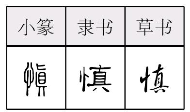 【提示】真,中间是三横,不要错写成两横; 中间的三横宋体与左右两边相接,楷体与左边相接,与右边相离。 *慎1〔昚〕shèn13画 心部 小心: ~重|~言|谨~|不~|谨小~微。