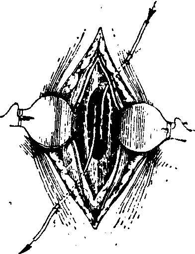(3) 清除病灶,闭式冲洗、负压吸引术: 对急性骨髓炎行此手术时只需敞开病灶,禁用刮匙刮病灶周围骨质。对慢性骨髓炎宜用于皮肤瘢痕面积较窄,在术终缝合伤口无张力者。操作如碟形手术,但须仔细彻底清除病灶,而后冲洗净伤口内游离的组织和骨屑及血块。然后自病灶上、下端骨膜下在距伤口约4~5cm处用套管针斜向穿出皮外,引入有侧孔的3mm直径塑料管各一根,分别作为冲洗、吸引管之用,要平顺地放入骨腔底,调整管的位置使之通畅无阻,并将它们贯穿缝合于皮肤,闭合伤口。术后3日内冲洗液 (生理盐水或生理盐水抗生素溶液),流入量要大些,滴入快些,每日约5~7公升以利冲洗和吸出脱落的组织屑和凝血块。术后3~4日即可减少冲洗液量。继续术前全身治疗。术后7~10日可先停止冲洗,但继续吸引1~2日即可拔出冲洗及吸引管,拆去缝线。