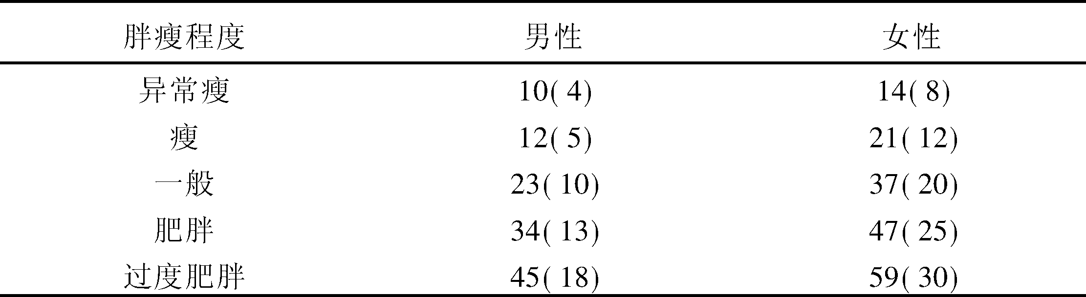 | 释义 | 成年人胖瘦标准 成年人胖瘦标准fat and thin criteria of adult下表数字是背部皮褶厚度与上臂部内褶厚相加所得;括号内的数值为腹部(脐右侧1cm处)的皮褶厚度(表)。 成年人胖瘦标准表(单位:mm)