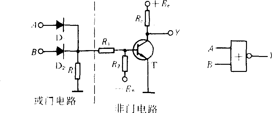 将 一级或门电路和一级非门电路连接起来构成的电路。简称或非门。它是具有多端输入和单端输出的门电路。当任 一输入端(或多端)为高电平1时,输出就是低电平0;只有当所有输入端都是低电平0时,输出才是高电平1。其逻辑关系的数学表达式为:Y=。下图是或非门的简单电路及其符号。下表列出了或非门的真值。