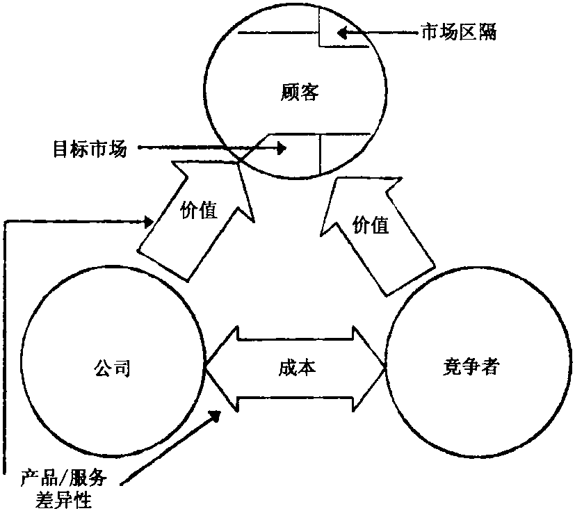 | 释义 | 战略三角形 战略三角形Strategy Triangle在制定任何一项经营战略时,都必须考虑到三个主角:公司本身、顾客,以及竞争者。这三个战略相关者,都各有其利益和目标,它们被统称为“战略三角形”或“战略金三角”。从战略三角形的角度看,战略家的职责是运用成功关键因素去达到相对于竞争者的优异成效。同时,战略家还要确使他的战略能使公司的实力符合明确界定的市场需求。因此,可以认为,所谓战略就是一个公司采取某种方式的努力,使得自身与竞争者有所差异,而能运用公司实力去使得顾客的需求得到更佳的满足,见图3-2。