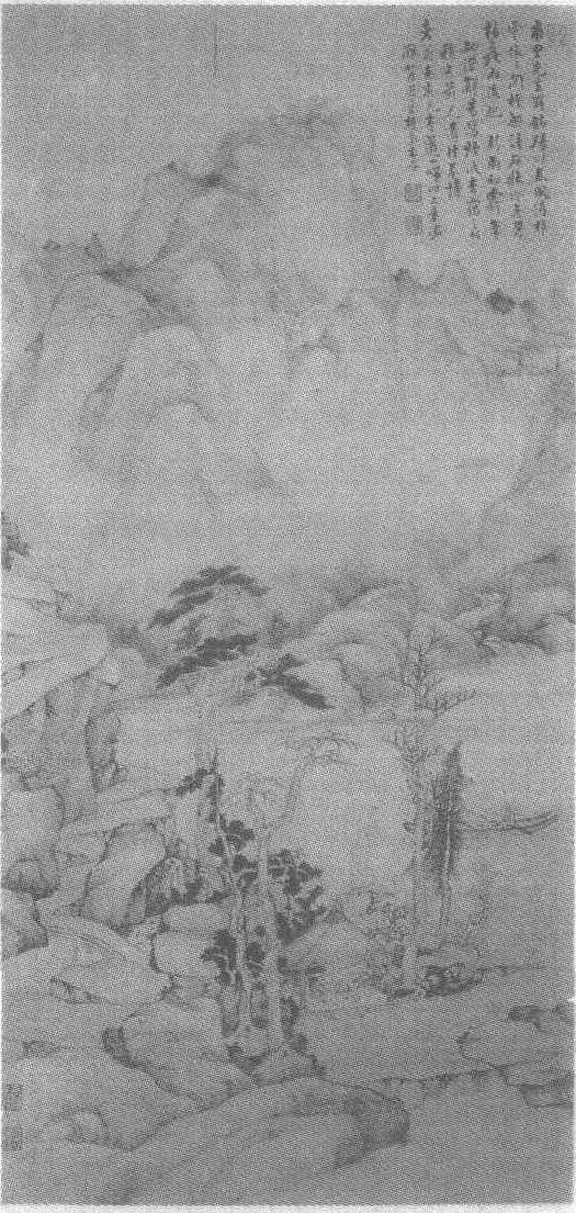 清。戴本孝绘。纸本设色。纵150.6厘米,横73.2厘米。江苏省苏州博物馆藏。戴本孝见《戴本孝峻岭飞泉图轴》条目。这是一幅描写春日雨霁,文人垂钓归来的作品。作者取河流及两岸一段的景致,水面开阔,流势平缓,一文人荡舟其上,即将靠岸。彼岸峰峦起伏连绵,山腰处可望飞瀑,一道清流从山中舒卷而出,注入大河。远树含烟吐秀,岸边有苍岩巨石,石缝间绿树青草悄然而出,溪泉萦回浸溢。平台处建一茅亭,石桌上有摊开的书籍,显然是垂钓者的读书处。其周围,古松苍秀,梅花绽开,秃树即将复苏。作者以枯笔焦墨绘就了一幅意境清雅秀逸的山水作品,构图疏旷,侧笔干擦,笔墨简洁,设色柔和,充分展现了初春雨后云霭远离,大地复苏的迷人景观。