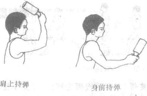❷持弹。肩上持弹法:投掷臂弯屈约90°,肘关节正对投掷方向,上臂约与肩齐平,使弹位于头右前上方。身前持弹法:持弹臂自然弯屈,持弹于体前,使弹与肩齐平或低于肩。