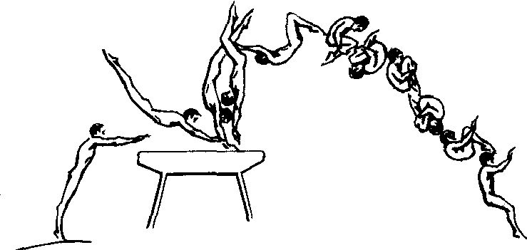 | 释义 | 手翻团身前空翻两周 手翻团身前空翻两周支撑跳跃最高难度动作之一。推手形成的支撑反作用力,通过人体总重心的后方,使身体产生同向转动进入腾空,属手翻空翻复合型动作。是古巴运动员洛切于1980年莫斯科奥运会上首先突破。同年,朝鲜人民民主共和国的一名女选手在高仅1.20米的横马上也攻克了这一动作。从此支撑跳跃中两周空翻这个禁区被打开,在跳马技术发展史上又增加了光辉的一页。运动形态特征是:前手翻推起在空中完成团身前空翻两周。技术要点:起跳后,顺势脚面用力带动下肢向上猛甩,同时上体下压,两臂远伸,当掌根触马的瞬间,全力回腿上顶,猛烈推离,紧接快速起肩,跟上体。继而屈腿足跟猛靠臀部,顺势迅速低头圆背、翻臀抱腿向前翻转(抱腿应是先抱后勒,这样有利加大第2周的翻转角速度)。当第2周将完成时,两臂举起、向上梗头带动向下伸腿,积极主动进入落地。通常当手翻团身前空翻一周的技术掌握得很定型后,方可练习这个动作。开始时仍然要求接团身一周,可将马前垫子逐渐加高,来加难完成一周空翻的“时、空”条件。与此同时,在弹跳板上多练习团身前空翻两周的技术,同样采用增加海绵包来限制其完成的“时、空”条件。随后可将马放在海绵坑边进行直接练习。随着动作的逐渐熟练,海绵坑内可增加海绵包,来缩短落下距离。当海绵包高度超过地面练习垫子的高度后,可伺机“登陆”。