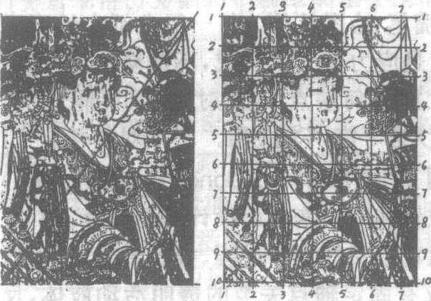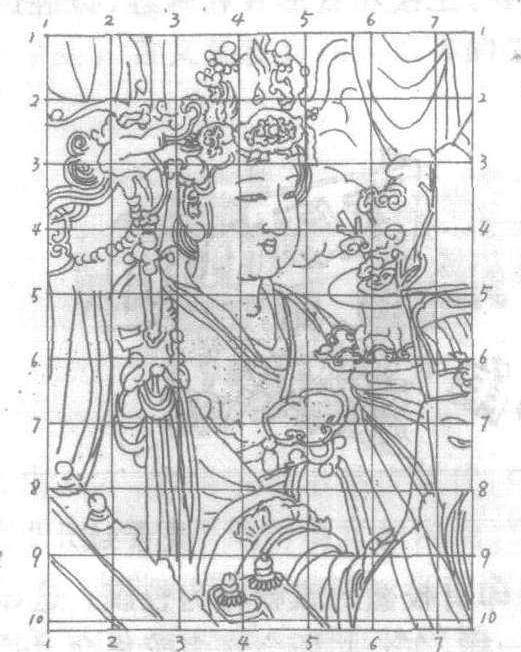 ❹放大绘画时,依经纬线的序号,寻找形象所在小格中的位置,如同找坐标点,对照小样再放大形象依照格次描画,将所有小格中的形象局部轮廓连接起来,整幅大画形象轮廓即成(图4)。
