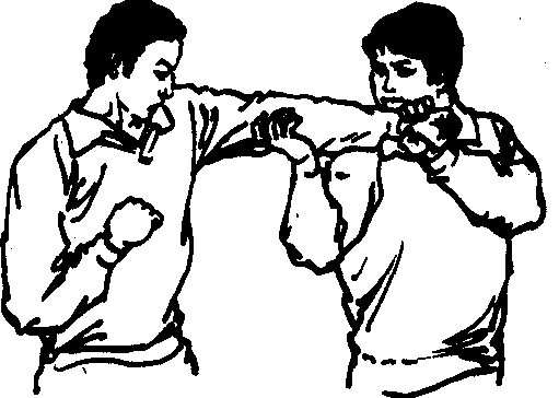 肘部擒拿法。当对方以左直拳进攻时,我先向右侧闪身,随之用左手抓握其腕部,使其外旋拳心朝上,然后以右手上托其肘关节,使其肘部处于被动状态。