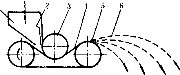 带式扬场机工作示意图 1.喂入斗; 2.闸门; 3.张紧辊; 4.胶带; 5.主动辊;6.抛出的谷物流 扬场机barnyard grain cleaner,grain thrower用于晒场翻晒粮食和初清选的机具。由刮板升运器、橡皮输送带、辊轴及动力等组成。橡皮输送带套在主、从动轴之间,在输送带上部又压着一个张紧辊,使输送带呈下凹形。工作时,由刮板升运器将粮食送到输送带上,输送带由电动机带动高速旋转,送到带上的粮食,通过上辊与皮带的间隙抛送出去。在抛送的过程中,还可将粮食中的轻混杂物分离出来。 扬场机用于清选和翻晒粮食的机具。分带式和风扇式2种。带式由喂料斗、输送带、辊轴及动力4部分组成。风扇式由螺旋输送器、风扇、电动机3部分组成。生产效率约为20 t/h。扬场机抛出速度约为15 m/s。 扬场机winnowing machine;winnower |