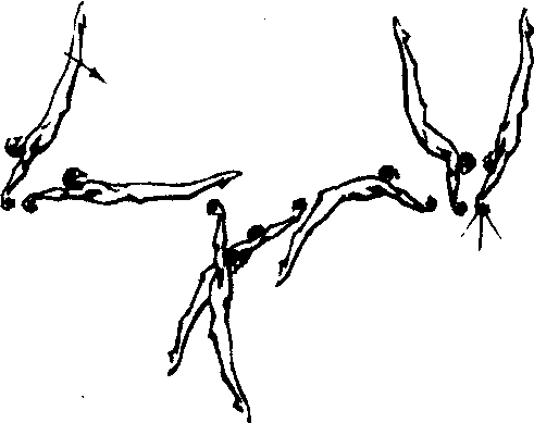 单杠中难度动作之一。通常是由摇浪前上、倒立中穿,经倒立转体换握和双手同时直接换握等形式来连接。它对运动员的手腕、肩带、髋部的柔韧性要求较高。技术要点:不论以何种形式连接,当成扭臂握倒立瞬间,脚面立即远伸,向后顶杠,尽量拉长人体,紧髋下摆。摆过杠下垂面后,稍抬头顺势压杠,含胸,提腰的时间要长。当上摆到杠水平面上后,继续扣腕下压,随即向前上方伸髋。待肩轴刚过杠上垂线,两腿前伸,两臂下顶,低头等髋前翻下摆。初学时应练习扭臂握悬垂小摆动和后撑靠墙倒立。然后,可在中杠高位保护下直接练习倒立姿势开始,中穿前上经倒立转肩向后跳下。保护者一手握其手腕,一手顺势托肩。进而在助力下直接练习。保护位置与方法同前。