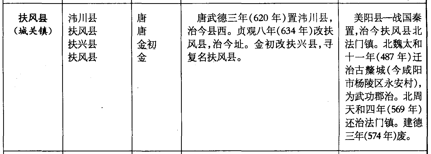 扶风县(城关镇)𣲗川县扶风县扶兴县扶风县唐唐金初金唐武德三年(620年)置𣲗川县,治今县西。贞观八年(634年)改扶风县,治今址。金初改扶兴县,寻复名扶风县。美阳县—战国秦置,治今扶风县北法门镇。北魏太和十一年(487年)迁治古𥼋城(今咸阳市杨陵区永安村),为武功郡治。北周天和四年(569年)还治法门镇。建德三年(574年)废。