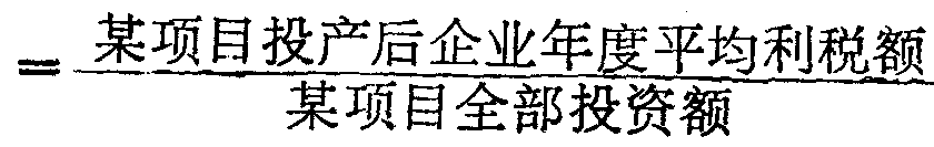 一个建设项目或企业所常采用的单位投资提供的利税额,是指项目投产后企业年度平均利税额与投资额之比值。其计算公式为:
