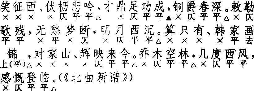 | 释义 | 折桂令 折桂令卢挚 小令 ![]() 全曲十一句:7△,4▲,4△。4,4,4△。7△,7△。4△,4,4△。第一、七、八句偶有减为六字句者。第五、六两句可合为上三下四式七字句。第九句下可增四字句,平仄同第九句,须叶韵,增一句者多;小令增三句者,如无名氏“酒能消闷”曲;剧套增三句者如王伯成《贬夜郎》,增四句者如宫大用(?)《七里滩》。第四、五、十句偶有叶韵者,以不叶为宜。〔折桂令〕有“短柱体”,即句中二字必藏韵,如虞集“銮舆三顾茅庐”曲;一名“叠韵”,如张可久“锦江头一掬清愁”曲。小令兼用。一名〔蟾宫曲〕、〔步蟾宫〕、〔蟾宫引〕、〔天香引〕、〔广寒秋〕、〔秋风第一枝〕。《广正谱》另列〔百字折桂令〕一章,以白无咎“敝裘尘土”曲为例,实即〔折桂令〕多加衬字衬句,足成百字,故名。其近百字者,如郑德辉“飘飘泊泊”首,亦属同类之作。《广正谱》又另立〔蟾宫曲〕一章,举汤式“冷清清人在西厢”曲为例,谓“与〔折桂令〕不同”。细按之实则无异,其第二、三句,第五、六句,第十、十一句,各四字句均用叠句;第七、八句下,又各增四字叠句一句;叠句既多,遂乱人意。《元本题评音释西厢记》等书附《闺怨蟾宫》四首,此为第三首,详《全元散曲》汤式曲校记。〔水仙子〕可连用〔折桂令〕为带过曲。〔正宫·叨叨令〕亦可连用〔折桂令〕为带过曲。 ☚ 甜水令 水仙子 ☛ 折桂令 折桂令曲牌名。又名 〔蟾宫曲〕、〔天香引〕、〔折桂回〕、〔蟾宫引〕、〔步蟾宫〕、〔广寒秋〕、〔秋风第一枝〕。属北曲双调。字数定格及韵式据清·周祥钰《九宫大成谱》作六、四、四、四、四、四、七、七、四、四(十句)。但第五句后可酌增四字句。近人吴梅《南北词简谱》注云:“按此调或十句、十一句、十二句、十三句,或多至十七句,句法皆大同小异。首句必六字,以下四字句,或四句或五句,再用六字二句,以下直至末句,俱四字语也。”据今人涂宗涛《诗词曲格律纲要》中对元人作品的考察,以作十一句或十二句为常见。十一句的句式及韵式作六、(七)、四、四、四、四、四、六(七)、六 (七)、四、四、四。末句增四字一句即为十二句; 增二句即为十三句。该曲调可单用作散曲的小令,也可用在双调套曲内。如昆剧《石秀探庄》石秀迷路时所唱。以唢呐、海笛或笛伴唱。 ☚ 驻马听近 滴滴金 ☛ |