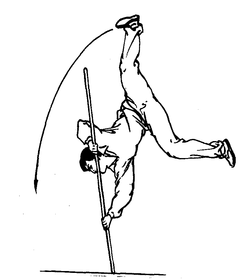 ❷拄地侧跳,两手握棍,棍端拄地支撑,棍身略成斜形、微后倾,两腿先后由棍身上侧跨越过去。抬头立腰,两腿不可触及棍体;