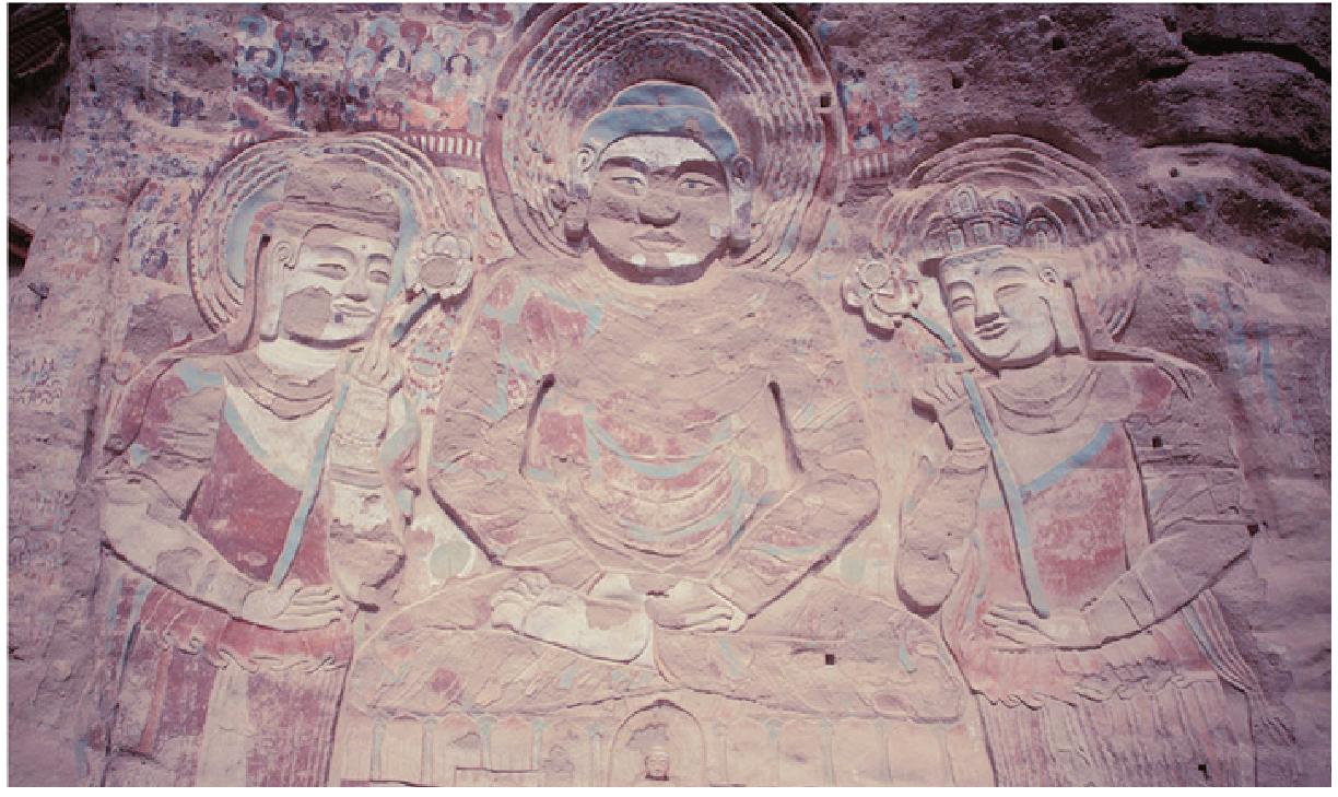 北朝石窟寺。一称大佛崖。全国重点文物保护单位。位于武山县榆盘乡楼湾村。建寺时自岩脚搭木至山巅,待修建完毕后拆木而下,故名。有岩崖摩崖高浮雕石胎泥塑释迦牟尼大佛和大势至、观世音菩萨,兼绘壁画、高塑小佛像。大浮雕占总面积的 50%,大佛高 40 余米,结跏趺坐于莲台上,禅定印,圆脸胖身,通肩袈裟,菩萨头戴花蔓冠,项佩条带式连珠璎珞,袒上身,手执莲花。里层为北周原作,表层为元代妆修。佛座从仰俯莲瓣形,上列雕塑动物图案,有狮、鹿、象等,每排 6~10个,中部头向前正视,余皆头侧向两侧,表现了释迦的另一种护法形式。莲台正中凿一人字顶浅龛,内高塑一佛二菩萨,其中立佛仅存头部,丰满圆润,系唐代佳作。大佛身上侧有北周立佛。北侧一长方浅平龛,内摩崖阴刻北周明帝宇文毓三年题记一方,面积 1.65 平方米,魏体竖写 12 行 99 字。文曰:“维大周明皇帝三年岁次己卯二月十四日使持节柱国大将军陇右大都督秦渭河鄯凉甘瓜成武岷洮邓文康十四州诸军事秦州刺史蜀国公尉迟迥与比丘释道减于渭州仙崖敬造释迦牟尼像一区愿天下和平四海安乐众生与天地久长周祚与日月俱永。”崖面还存小龛 8 个,其最低小龛造像为元代作品,大佛头顶千佛壁画,遮檐上部悬塑喇嘛教塔,均为元代之作。