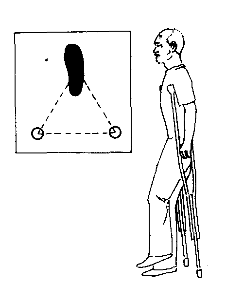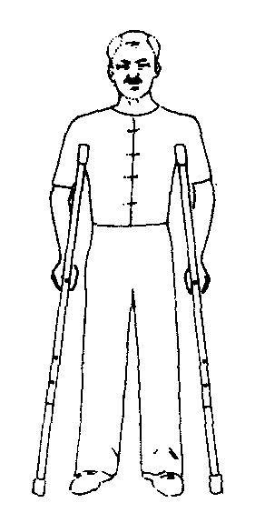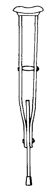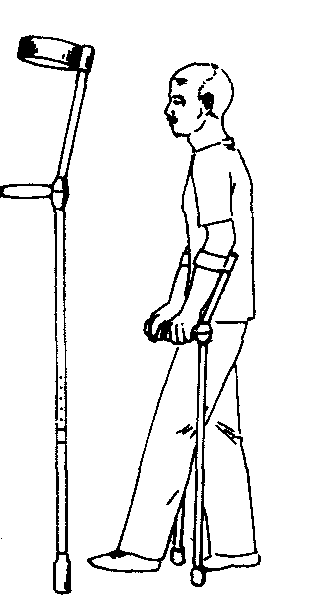拐杖是辅助步行的一种工具,可帮助残疾人行走时增加稳定性,并能减少下肢的承重。常用的拐有长臂拐(腋拐)、短臂拐(前臂拐),其它还有临时拐,轮拐,双杠拐等。最常用的是长臂拐,多选用弹力强质地坚硬的木料和轻金属制成。拐下端装有橡皮套防滑,上端有海绵垫。其长度从腋窝到脚为宜,可根据病人身高调节。过高可使腋下疼痛,过低屈背易感疲劳。拐的把手按病人上肢的长短调节,以屈肘30度为持重力最大。拐可用单拐或双拐,使用单拐时大部分将拐置于健侧,因患肢不能完全负重,而借助拐来增加健侧对整个身体的支撑。当一侧下肢完全不能负重时,必须用双拐。使用双拐行走方法:三点步态,如一侧截肢病人,在行走前先将两拐同时放在健腿前方,然后抬起健侧腿移到两拐的前方,再将两拐同时向前移到健腿前方,如此反复。但注意拐着地的两点和健侧脚着地点永远保持三角形,不能在一直线上以免失重。两拐之间的宽度,以两肩之宽度为宜,行走时两手紧握把手,用两上肢支持体重而不是靠腋窝支撑,否则会压迫腋下神经而导致神经瘫(拐仗瘫)。行走时注意地面不要有水以免滑倒。