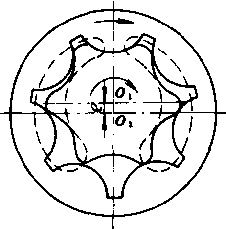 图1 齿轮泵工作原理 液压泵旋转一周所排出的油液容积为排量。定量泵的排量固定,变量泵则可变。单位时间内液压泵的输油量为流量,流量是排量与液压泵转速的乘积。液压泵进出口之间的压力差与流量的乘积是液压泵输出的液压功率。 液压泵按结构可分为齿轮泵、转子泵、滑片泵和柱塞泵等。 齿轮泵 为定量泵。常用的外啮合齿轮泵(图1)由一对渐开线圆柱直齿齿轮组成。齿轮齿顶与壳体内腔以及齿轮端面与壳体侧壁分别作为径向和轴向的密封表面,使各齿间形成封闭油腔。啮合点M将正在进行啮合的各齿隔开成左右油腔。齿轮按图示方向旋转时,右腔各齿退出啮合,容积扩大成为吸油腔;左腔进入啮合,容积缩小成为压油腔。 高压齿轮泵为了减少端面泄漏,前后轴套是轴向浮动的。出油道上的高压油液被引到轴套背面,把轴套压紧在齿轮端面上。压紧力与液压泵出油压力成正比,可减少由于压力升高而引起的端面泄漏。外啮合齿轮泵结构简单,造价低廉,体积小,重量轻,是在拖拉机和农机上应用最广泛的中高压液压泵。 转子泵 由短幅外摆线等距曲线齿形的内转子(主动)和圆弧齿形的外转子(从动)组成(图2)。内外转子齿数相差一齿,各自绕偏心距为e的两个中心旋转,方向相同。旋转时啮合点改变位置,形成了容积可变的各封闭油腔。右侧各腔吸油;左侧则排油。内转子每转一圈,每个油腔各完成吸油和排油一次。转子泵常用作中、低压液压泵。