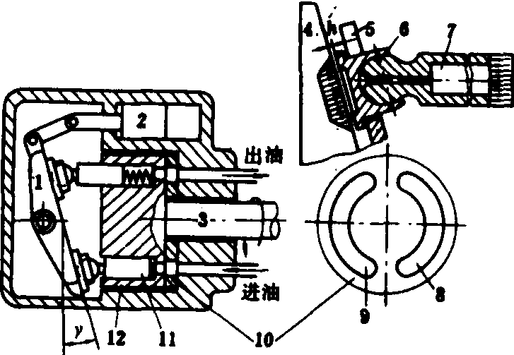 图3 滑片泵工作原理 柱塞泵 靠柱塞往复运动实现容积的变化。柱塞和柱塞孔容易精密加工,密封性好,高压下能保持较高容积效率。柱塞泵按柱塞布置可分轴向式和径向式两种。 轴向柱塞泵 结构及工作原理如图4所示。缸体由驱动轴带动旋转,缸体内的柱塞靠斜盘实现往复运动。柱塞中有半数进油,另一半出油,进出油分别由配流盘汇集或配流。改变斜盘的斜角γ即可改变排量。柱塞端头与斜盘之间有相对滑动,其间装有滑履。滑履将柱塞内的高压油液引到底部,液压力垫起滑履使它静力平衡,油膜减少磨损,提高机械效率。轴向柱塞泵单位功率重量小,但结构较复杂,使用维修要求严格,常用于大功率拖拉机上具有压力一流量补偿的闭心液压系统中。