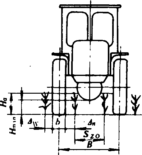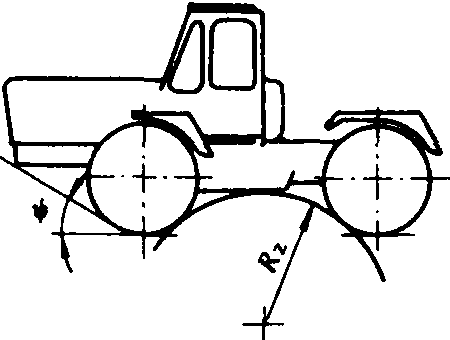 图1 拖拉机行间通过性 障碍通过性 指拖拉机能否通过局部起伏不平地段和跨越障碍的性能。这是拖拉机顺利进行田间转移所必需的。要求拖拉机必须具有足够的最小离地间隙Hmin、接近角、离去角 和纵向通过半径RZ(图2)。Hmin直接影响拖拉机跨越障碍物或田埂的高度,要求一定的、 和Rz值是保证拖拉机在起伏不平地段行驶时,其机身的前部、中部和后部不能触及地面。一般农业拖拉机的、 都较大,只有某些特殊拖拉机才给予必要的注意。