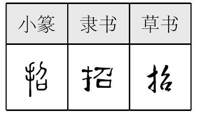 招Zhāo现行较罕见姓氏。今湖北之武昌,山西之太原,广西之田林、荔浦,广东之新会、澄海、高要、高明等地均有分布。汉、蒙、鲜、傣等多个民族皆有此姓。《郑通志》、《续通志》、《清通志》之 《氏族略》亦俱收载。其源不一: ❶郑樵注云: “晋步摇之后。”此以名为氏,当出自步姓。 ❷ 《姓氏考略》注引 《姓谱》云: “陈侯之弟招放越,其子孙以王父字为氏。”望出南海。 汉代有招猛,大鸿胪; 明代有招用,永乐举人;又有招于莘、招宗广,任知县; 清代有招昌韶,任广东阳江县教谕。 招zhāo❶招致。归氏子《答日休皮字》:一包闲气如长在,惹踢招拳卒未休。 ❷邀,约。薛能《牡丹》之二:招欢忧事阻,就卧觉情牵。李白《九日登山》:因招白衣人,笑酌黄花菊。 招1.zhāo ❶招來,引致。杜篤《論都賦》:“慢藏招寇,復致赤眉。”班固《幽通賦》:“溺招路以從己兮,謂孔氏猶未可。” ❷通“昭”。彰明。張衡《東京賦》:“招有道於側陋,開敢諫之直言。” 2.sháo 見“招2搖”。 招 招zhāo招手,打手势叫人。《王风·君子阳阳》二章:“君子陶陶,左执,右招我由敖。”毛《传》:“陶陶,和乐貌。,纛也,翳也。”郑《笺》:“翳,舞者所持,谓羽舞也。君子左手持羽,右手招我,欲使我从之于燕舞之位。” ☚ 拂 招招 ☛ 招读音sh·ao(ˊ),为ao韵目,属ao—iao韵部。时饶切,平,宵韵。 ❶虞舜时乐名,通“韶”。 ❷朱骏声注:“招,假借为韶。” 上一条: 芍 下一条: 韶