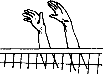 ❸空中动作:起跳后,两手从额前贴近球网上沿向前上方伸出,两臂伸直,两肩尽量上提,两臂保持平行,两手自然张开,两手之间距离小于球径。当手触球时,突然紧张,手腕下压盖住球的前上方。为防止打手出界,外侧手掌心应内转包球。
