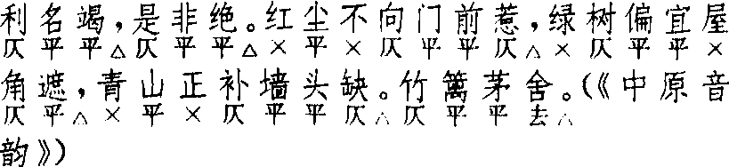 △。首二句宜对。第三、四、五句,因分段不同,或二句对,或鼎足对。末句亦有不同,可作上三下四式七字句,可作四字句。《中原音韵》“作词十法·末句”定为仄平平仄平平去,作七字句;而“作词十法·定格”两收马致远“百岁光阴”曲,又皆为四字句。按之元人诸作,以作四字为多。赵明道“多绪多情”套第三句作六字折腰句,吕止轩“颜色天然”套第四句作上三下四式七字句,皆偶然例外。分段有二式:其一,首三句一段,中间两句对,末句独立,如“布衣中”曲;其二,首二句一段,中三句鼎足对,末句独立,如“利名竭”曲。马致远所作,两种分法都有;乔吉、张可久均用第二式。马致远“菊花开”首,三个七字句均用三个三字名词构成:“菊花开,正归来。伴虎溪僧、鹤林友、龙山客,似杜工部、陶渊明、李太白,有洞庭柑、东阳酒、西湖蟹。哎,楚三闾休怪。”增句在第五句下:增四字句二句者,见王伯成《天宝遗事》“一纸皇宣”套;增四字四句者,见白朴《梧桐雨》、杨景贤《刘行首》、赵明道《范蠡归湖》残折。此种增句系带唱性质,不叶韵,字声调谐即可。小令未见增句。小令兼用。一名〔续断弦〕。