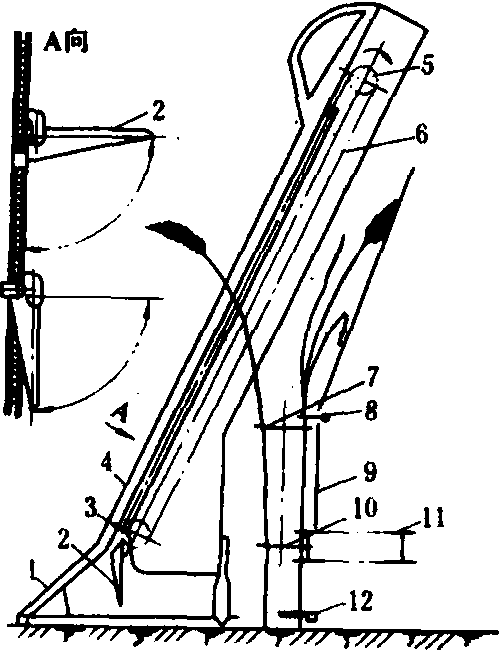 图2 普通拨禾轮工作过程简图 偏心拨禾轮 在普通拨禾轮的基础上,增加了偏心机构和搂齿。搂齿端点的运动轨迹与拨禾板端点相同,仍是余摆线。而偏心机构使搂齿作平面平行运动,即运动过程中搂齿方向保持不变。此方向可按作物倒伏方向和倒伏程度进行调节,使两者的方向基本一致,从而有利于搂齿插入作物丛将作初扶起,并减少对作物穗头的冲击作用。偏心拨禾轮对收割一定倒伏程度的作物,比普通拨禾轮可明显减少谷粒损失。 为了适应收割不同高度、不同倒伏程度、不同产量的作物,拨禾轮的转速、轮轴的垂直位置和水平位置均可进行调整。 扶禾器 能扶起倒伏角在75°左右的作物。扶禾器的工作元件是安装在扶禾链上的拨指。常见的扶禾器有铅垂面型和倾斜面型两种(图3)。前者的扶禾链在铅垂面内运动; 后者的扶 图3 扶禾器禾链在倾斜面内运动。扶禾器一般用在立式割台的割捆机和半喂入联合收割机上。