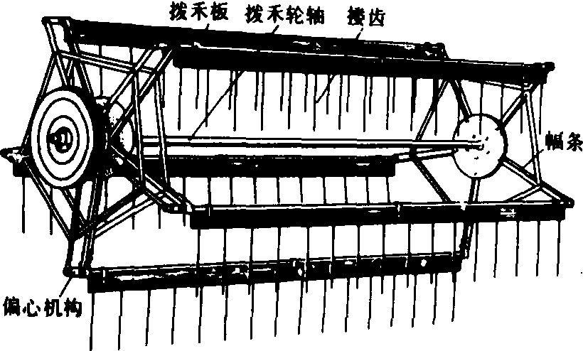 | 释义 | 拨禾扶禾装置crop sweeping and lifting device将作物引向或扶起后引向切割装置,并将割后作物送向割台输送装置的部件。按其结构型式可分为拨禾轮和扶禾器两类。