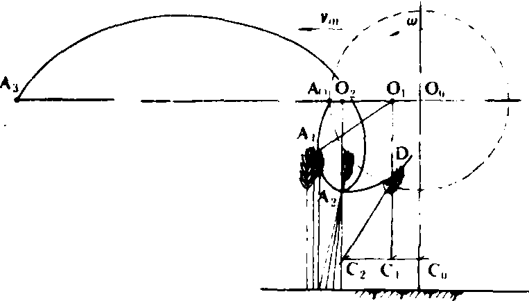 图1 偏心拨禾轮 普通拔禾轮 由拨禾板、拨禾轮轴和幅条等组成。其工作过程如图2所示。工作时,拨禾板(装在O0A0辐条外端)随机器前进(前进速度为υm),同时绕轮轴回转(回转角速度为ω),两个运动的合成使拨禾板端点A0相对地面作余摆线运动(A0A1A2A3拨禾板运动轨迹。O0O1O2拨禾轮轴运动轨迹)。当拨禾板从点A0运动到点A1时,开始插入作物丛,随着拨禾板的继续运动,作物被引向切割器,当拨禾板到达点A2时,作物在拨禾板扶持下在C2处被切割器(C0C1C2割刀运动轨迹)切断,随后,拨禾板相对割台作圆弧运动(A2D曲线),将割断的茎秆向后推向割台。