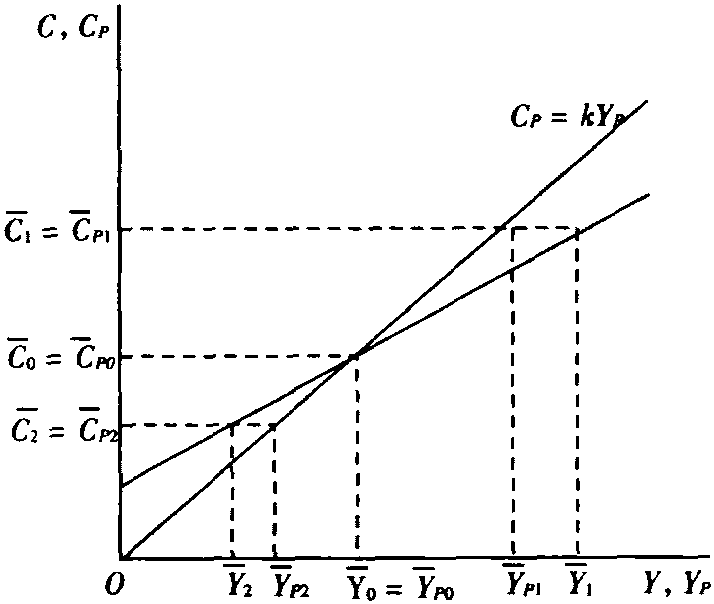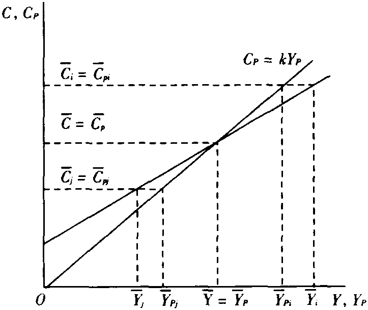 (5) 消费与消费支出的区分,导致了对储蓄含义的不同理解。弗里德曼区分了消费和消费支出的不同含义。消费是指家庭对购买来的消费品和劳务的实际消费量,消费支出是指购买消费品或劳务时的实际支出。就劳务和非耐用消费品而言,消费支出和实际消费可以看成几乎是同时发生的,它们之间没有实质性区别; 但对于耐用消费品则不然,耐用消费品被购买后,是供长期消费用的,实际消费相当于耐用消费品的折旧额,消费支出与实际消费就不同了。持久消费和暂时消费实际上指消费而不是消费支出,这一点是持久消费和持久收入保持固定比例的前提条件。消费支出与消费的区别导致了对储蓄的不同于凯恩斯 (J. M.Keynes) 的绝对收入假定的理解: 凯恩斯的储蓄=收入-消费支出 根据持久收入假定可以导出横截面消费函数、短期消费函数和长期消费函数,以此来解释预算研究和时间序列研究所揭示的消费和收入之间的关系。就横截面情况而言,对每一个收入组i, 都存在着 ti=0,于是 i= pi。又由于 pi=k pi,于是有
