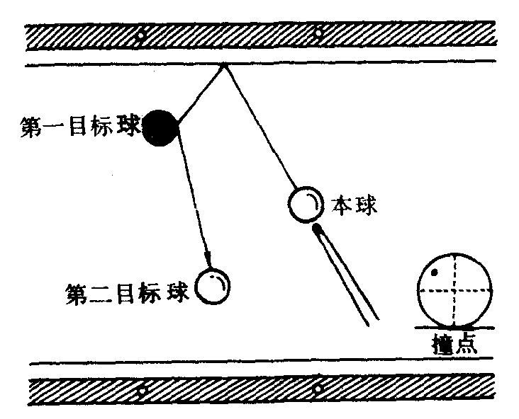 台球击球的一种方法。本球首先碰岸,使其轻轻地迎向第一目标球,碰撞时使本球有轻挂一下的感觉,然后再碰撞第二目标球。采用挂球杆法时,应注意以下3点:第1本球的碰岸点;第2要计算从岸边反弹出来的反射角和计算撞击的厚度;第3要预测好从第一目标球到碰撞第2目标球过程中,本球的行进路线。挂球的基本瞄准方法要根据球势选择瞄准点,若如图所示的分布情况(图2—3—42),撞点为左侧上部,用增大顺旋撞击碰岸点,并且要比采用中上杆打法的碰岸点略微向前瞄准一些。