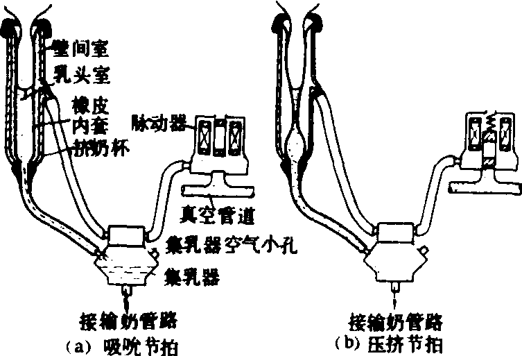 图2 液气式脉动器工作简图 1.空心连杆;2.上阀门;3.中心孔道;4.节流孔道;5、13.液体室;6、12.橡皮膜;7、11.气室;8.下阀门;9.右脉动真空输出管(供应两个挤奶杯的脉动室);10.左脉动真空输出管(供应另两个挤奶杯的脉动室) 集乳器 由集乳室和脉动分配室组成。脉动分配室将脉动器输出的脉动真空,送到各挤奶杯的脉动室,集乳室将真空泵输出的固定真空送到挤奶杯的乳头室,并汇集挤下的牛奶,输往奶桶或输奶管路。 乳头室内为固定真空。当脉动器向集乳器输出真空时,挤奶杯的脉动室也呈真空状态[图1(a)],橡皮内套内外无压力差,内套张开,乳头在真空作用下,括约肌开放,牛奶被吸出,此过程称吸吮节拍;当脉动器输出大气压力时,挤奶杯的脉动室呈大气压力[图1(b)],橡皮内套在内外压力差作用下向里压挤乳头,使括约肌关闭,奶停止流出,此过程称压挤节拍。依此不断重复,形成二节拍的工作循环。为使汇集在集乳器集乳室内的牛奶能顺利流出,集乳室上方设有直径为0.8毫米的气孔。 挤奶器的真空度高低及其稳定性、脉动频率(每分钟的脉动循环次数)和节拍比(吸吮节拍与压挤节拍所占时间之比)对挤奶作业有重大影响。真空度高能使乳头括约肌开放,加快挤奶速度,但容易引起乳头肿胀,使剩余奶量增加;真空度低会影响乳头括约肌开放,降低挤奶速度;合适的真空度应在挤奶杯内保持44~50千帕。稳定的真空度能提高挤奶效率和防止发生乳房炎。真空室稳定性应以挤奶时挤奶杯不从乳房脱落为度。集乳器堵塞,输奶管路坡度不合适,橡皮内套破损,转移挤奶器,真空贮备不足等都会引起真空度的波动。提高脉动频率和加大节拍比对提高挤奶速度有利,但易引起乳头括约肌的疲劳、肿胀和充血,奶不易挤尽。合适的脉动频率为每分45~70次,节拍比1.5~3.0∶1。根据国际标准推荐:在一脉动周期内,挤奶杯脉动室内正常的工作真空所占时间不应少于30%,大气压力时间不少于15%。 挤奶器用于吸取牛奶的器具。1903年英国首先研制出真空挤奶器。挤奶器由挤奶杯,脉动器和集乳器3部分组成。按挤奶节拍可分为3节拍和2节拍2种类型。适宜的脉动频率为45~70次/min,节拍比为(1.5~3.0)∶1,挤奶杯内应保持44~50 kPa的真空度。1998年中国拥有机动挤奶器1511套。 |
