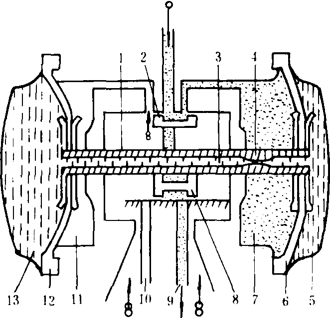 图1 二节拍挤奶器工作简图 挤奶杯 产生类似于小牛吸奶的动作,使乳头不断受到真空吸吮和挤压,将奶吸出。它由不锈钢制的金属圆筒和橡皮内套组成。内套内部的空间称为乳头室,输入固定的真空压力;内套与金属圆筒之间的环形空间称为脉动室,通入由脉动器供应的脉动真空。内套富有弹性,其两端能将金属圆筒密封,口部大小适宜,使套上乳头时空气不会泄入乳头室。 脉动器 将输入的固定真空转变为真空与大气交替变化的脉动真空,供应挤奶杯的脉动室,以产生不同的工作节拍。脉动器有液气式、气压式、电磁式等三种。液气式脉动器(图2),由器体、上下阀门机构、橡皮膜片和连接两膜片的空心连杆组成。两膜片在器体的左、右形成4个相互隔开的小室:中间两个小室为气室,交替通入真空或大气,由上阀门机构控制;左右端部两个小室,充满液体,通过空心连杆中的节流孔相互沟通。下阀门为脉动真空输出阀,随空心连杆一起运动,并带动上阀门。当连杆处于右侧极端位置时,下阀门使真空通向右输出管道,左输出管道则与大气相通。同时上阀门使右侧气室通入真空,左气室进入大气。膜片在压力差作用下,与空心连杆一起向左侧移动,使左侧端部的小室体积变小,液体通过空心连杆的节流孔流向右侧端部小室,直至上、下阀门移动到左侧位置;此时右输出管道与大气相通,左输出管道输出真空,左右气室也同时发生相反的变化。在反向压力差作用下,膜片带动空心连杆开始向右运动,依次不断重复,使输出管道不断输出脉动真空。膜片往复转换的频率取决于空心连杆中节流孔的大小,它控制液体从一侧小室流向另一侧的速度,节流孔小,膜片移动速度慢,脉动频率低。反之则频率高。液气式脉动器,其液体在密闭系统内流动,不受外界条件影响,工作稳定可靠,但结构复杂。气压式脉动器利用橡皮膜片两边压力差的变化来带动阀门的转换,结构简单,但脉动频率易受环境温度和尘垢堵塞工作沟道的影响。电磁式脉动器是利用电磁线圈电路的通断所产生电磁力的变化,带动阀门转换,工作稳定、可靠,但需由脉动控制器来控制电路的接通和断开,常用在大型管道式挤奶机上。脉动控制器是一电子定时器,能产生具有各种频率的电路通断信号,以控制各挤奶器上的电磁式脉动器。