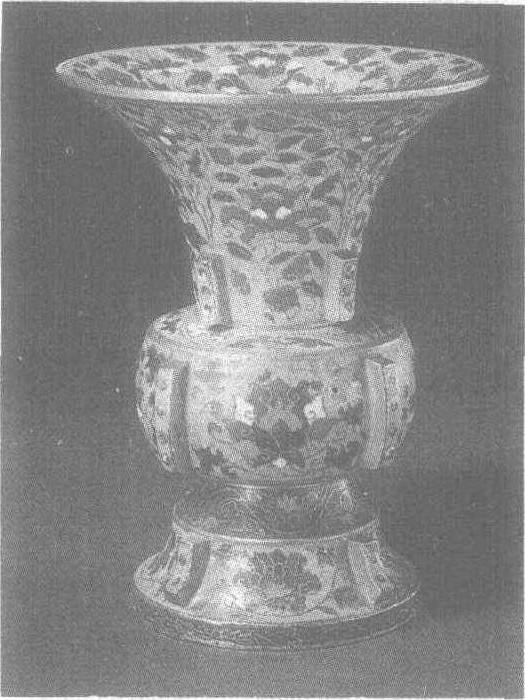 明宣德。高18.5厘米,口径14.3厘米,底径9.8厘米。北京故宫博物院藏。尊为铜胎镀金。圆形,撇口圈足,四组出戟。通身以浅蓝釉为地,颈、腹、足及口内均饰掐丝勾莲纹,填红、白、黄、宝蓝四色釉作花纹。底中心刻十字形杵,靠一边刻阳文横单行“大明景泰年制”楷书款,系后来补刻。此器为御用监制造。