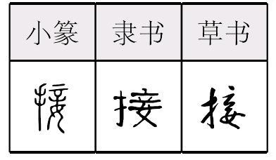 jiē形声,从手,妾声,本义为两方面接触而会合,引申为连接、连续不断、靠近、托住、接受、迎接、接替、收取等。 |