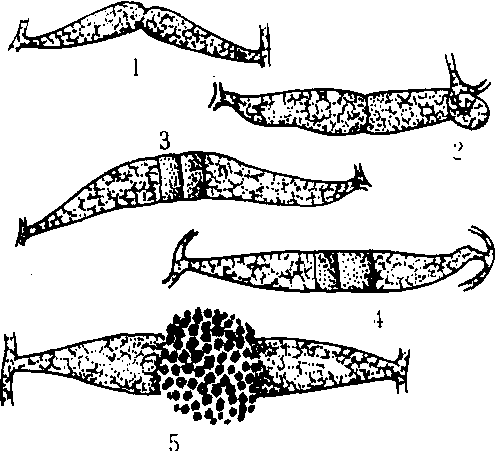接合孢子形成过程 1、2.原配子囊 3. 配子囊形成 4. 质配 5. 接合孢子形成 接合孢子真菌中由同型配子或配子囊接合后所产生的厚壁休眠孢子。如黑根霉。 接合孢子zygospore属有性孢子,由两个相同菌丝体末端细胞融合而成。藻菌纲中的毛霉菌和根曲菌常形成接合孢子。 |