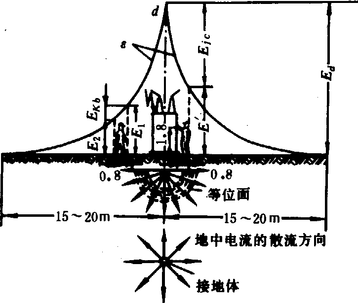 注: 1. I为计算用的流经接地装置的入地短路电流;2. 在采用接零保护的电力网是指变压器的接地电阻; 3.为了运行人员的安全,应限制接地电压。仅用于高压设备的接地装置,按规定限值为250伏及以下; 当接地装置为高、低压电气设备共用时,限值为120伏及以下。 接触电势、接触电压、跨步电势和跨步电压 接地电流由接地装置在地中向四周流散,于是在接地装置附近大地表面各处的电位分布将有所不同(图4)。人手触及故障设备的外壳脚直接与地面接触时,人体的手与脚即处于不同的电位下。此两点的电位差称为接触电势Ejc,人的手与脚间所承受的电压称为接触电压。地面上水平距离为0.8米(相当于人跨一步的距离)的两点间的电位差称为跨步电势Ekb,人体两脚接触该两点时所承受的电压称为跨步电压。人体所能耐受的接触电压和跨步电压允许值的大小与通过人体的电流值、持续时间长短、地面土壤电阻率以及电流流经人体的路径有关。 在大接地电流系统中接触电势与跨步电势的允许值为: