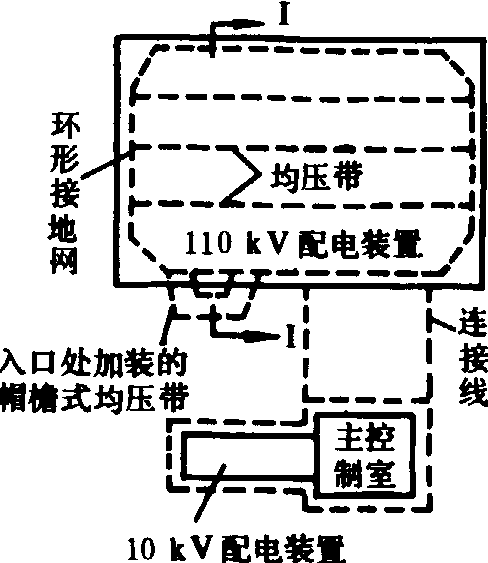 接地装置的实施 接地装置的接地体有自然接地体和人工接地体两种。前者包括埋在地下的金属管道、金属井管、金属结构和混凝土基础等。人工接地体一般情况下,以水平接地体为主,可采用扁钢、圆钢。垂直接地体可采用角钢、圆钢等。在下变电站内水平接地体构成人工接地网,接地网的外缘闭合,网内敷设水平均压带,将自然接地体与接地网可靠地连接,形成均衡电位接地系统(图5),以减小接地网内的接触电势和接地网外的跨步电势。人工接地网所覆盖的面积较大,网孔较多,网间有相互屏蔽作用,其接地电阻Rd(欧),可按下式计算: