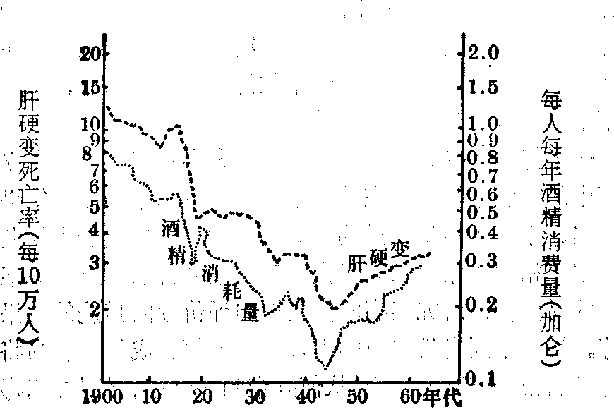 图1 1900~1963年英国肝硬变死亡率与每人每年酒精消费量(自M.Terris,1967)