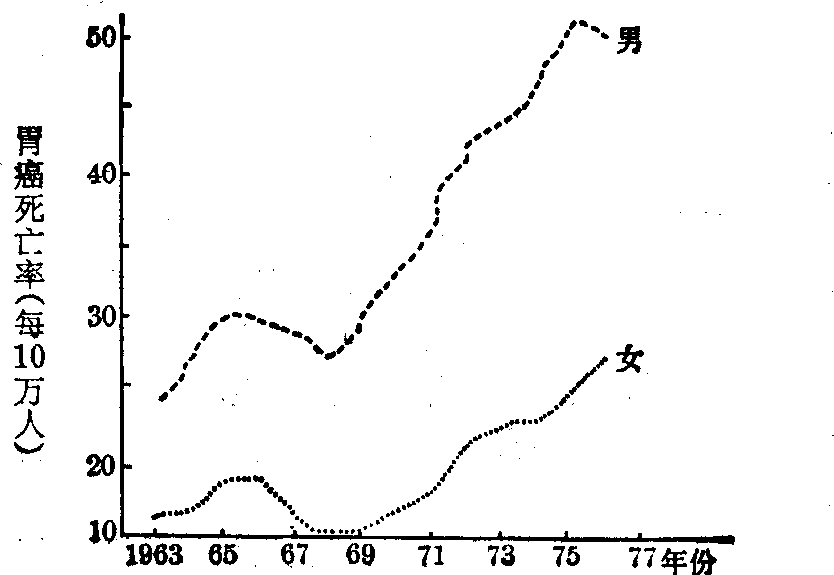图2 上海市1963~1976年胃癌死亡率 近几十年来,细菌性痢疾发病率上升而病死率下降,轻型病例及带菌者增多,发生明显的变迁。这主要是菌型的构成有很大变化,宋内和福氏痢疾不断增高,而志贺痢疾明显减少。这可能由于前两种菌型在外界抵抗力较强,它所引起的病例轻型居多;而志贺菌在外界生存能力弱,它所引起的临床症状较重,易于发现及时予以隔离治疗等。近百余年来,猩红热的病死率一直在下降,但发病率并无变化。有些疾病由于有了有效的防治手段,其发病率已逐渐下降,有的被控制在相当低的水平,如脊髓灰质炎、麻疹、白喉等; 有的已经被消灭如天花。但同时也有些疾病在长期观察中有明显上升趋势,例如病毒性肝炎、肺癌、精神障碍等。 (2) 周期性流行: 周期性是指传染病经一定周期发生一次大流行。有些传染病发病率的起伏不是年年一致的,一次流行出现之后,随着1年或数年内仅有幅度参差不齐的小起伏,然后再来一次显著的高峰。出现周期性的疾病往往具备以下几个条件: ❶流行的起伏主要受人群免疫水平升高或下降的影响; ❷人口较多的地区,如都市,经常有该病种存在,不须自外地输入; ❸传播机制容易实现,人人经常有同等被感染的机会; ❹没有特效的控制措施或有而未用。周期性流行主要是一些呼吸道传染病,如猩红热、水痘、百日咳、流行性感冒等。 周期性的周期长短不是固定的,而是可以改变和消灭的。例如,过去城市麻疹的周期性表现很明显,随着麻疹活疫苗的广泛应用,目前许多城市已改变了麻疹周期性流行的面貌。天花原来也有周期性,实施普遍种痘,天花就不发生了。 了解和研究各种传染病的周期性变化规律,可以提前做好预防工作,以利于控制疾病的流行。 (3) 季节性升高: 某些传染病在一定的季节内呈现发病率升高的现象,例如流行性脑脊髓膜炎在冬春之交,流行性乙型脑炎在夏秋之交,流行性出血热在秋冬季,疟疾在秋季,霍乱在夏季,伤寒在秋季等。各病的季节性升高主要由于该季节存在着有利于该疾病传播的因素。 虫媒传染病的严格季节性主要与吸血节肢动物的寿命、数量、吸血次数、活动能力、媒介体内病原体的发育和致病力等有关,而这些又都直接受到温度、湿度等的影响,如疟疾、丝虫病、流行性乙型脑炎、鼠疫等。 肠道传染病多见于夏秋季,其原因一般认为: 气温较高,某些细菌在食物或水中(如E1 Tor型霍乱弧菌)易于生长繁殖,易造成感染;夏季地面水、井水的污染机会多,加之饮用生水的频率和数量大以及生吃瓜果的机会增加等。 还有许多疾病季节升高的原因未搞清楚。如同为呼吸道传染病的麻疹、白喉、流行性脑脊髓膜炎等,其季节性不完全相同;百日咳没有一定的季节升高;流行性感冒的流行也不一定与冬季有关系。 某些病的季节性升高虽还不能一一得到解释,但这问题是值得研究的,因为通过这种研究可以更好地了解影响季节性升高的原因及有利于实现传播机制的因素,从而采取更有效的防治措施。 3. 疾病的地区分布:疾病在世界各地区的分布不完全相同,有些病只限于某些地区,有些病虽然全世界都有,但各地区分布的数量和流行发展动态却有区别。不同地区疾病分布的研究是流行病学的重要方法。通过这些研究,阐明分布不同的原因,这对防治策略的拟定有帮助。研究此项问题者特别需要有医学生态学观点。 疾病的分布资料可以按不同人群或时间绘制出其地区分布图称为疾病分布图,例如肿瘤死亡世界分布图等。用标点代表病例标记在地图上以说明疾病的地区分布的称为标点地图。不同时间的标点地图还可以说明其时间的动态。它有助于流行病学分析。例如Snow于1854年用标点地图来分析霍乱与水的关系。又如用这方法分析了Burkitt淋巴瘤与昆虫媒介的关系。 对于病因不明疾病,可以通过不同地区疾病发生频率的比较,以及环境因素、社会因素的比较,可能获得有关病因的线索。如果对于一些病的原因已有了一些线索或假说,那就可以通过因素不同的地区、或因素相同但暴露程度不同的地区的发病率的比较来证明或否定这些线索或假设。 不同地区疾病分布的不同,有的是容易解释的,有的目前不易解释。寻找疾病分布不同的原因可从三个方面着手:居民的特性,致病因子的特性,环境。各因素可单独发生作用,或者在更多情况下联合发生作用。如果疾病的发生确与当地环境的固有因素 (如理化因素、生物因素)有关,可出现下列特征: ❶当地不同种族的发病率均高; ❷同种族居住于别处者患病不多; ❸外来居民经一定时期后同样发病; ❹当地居民迁出后发病降低; ❺动物可能有类似病症。一般认为上述五点是判断地方性疾病的依据。 (1) 地区和国家之间疾病的分布: 不少疾病在世界各个地区或国家间分布极不均匀。黄热病呈地方性分布于南美和非洲;各类肿瘤既是普遍分布于各国,而又是相对集中于某些地区,有些肿瘤高发区与低发区之间相差明显,发病率(或死亡率)相差倍数可高达数百倍。 世界各地肿瘤高低发区发病率差异(男35~64岁组)