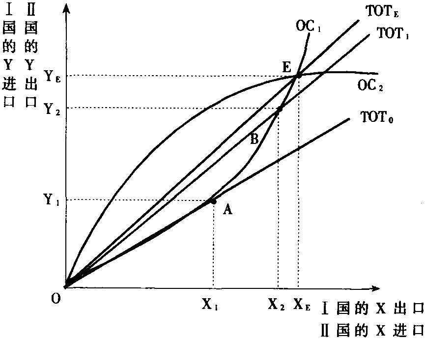 ☚ 相互需求论 马歇尔—艾奇沃斯曲线 ☛ 提供曲线 提供曲线offer curve国际贸易理论的重要分析工具之一。又称“相互需求”曲线(reciprocal demand curve)。它表示了一国在各种不同的贸易条件下所愿意进行的进口和出口数量。换言之,它呈现的是一国在各种可能的贸易条件下的贸易意愿。在图中,OC1是Ⅰ国的提供曲线。它表示当贸易条件为TOT0时,该国愿意出口OX1单位的X产品和进口OY1单位的Y产品。A点即为该国在TOT0时的贸易意愿。同样,当TOT上升到TOT1时,该国的贸易意愿在B点即愿意出口OX2单位的X,进口OY2单位的Y。把Ⅰ国在各种不同的贸易条件下的贸易意愿点连接起来就构成了OC1。同理可以做出Ⅱ国的提供曲线OC2,它代表了Ⅱ国在各种可能的贸易条件下的贸易意愿。OC1与OC2交于E点,E点即为国际贸易均衡。在该点,Ⅰ国所愿意提供的出口数量OXE正好是Ⅱ国的进口需求数量,而Ⅱ国所愿意提供的出口数量OYE正好等于Ⅰ国对Y产品的进口需求。此时的均衡贸易条件为TOTE。穆勒(J.S.Mill)最早提出了提供曲线的思想。而其几何表述则由马歇尔(Alfred Marshall)及埃奇沃思(F.Y.Edgeworth)完成。