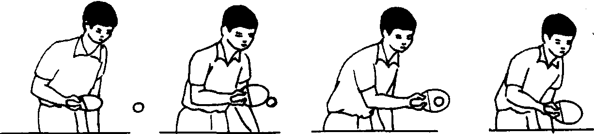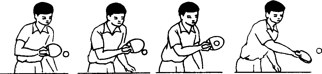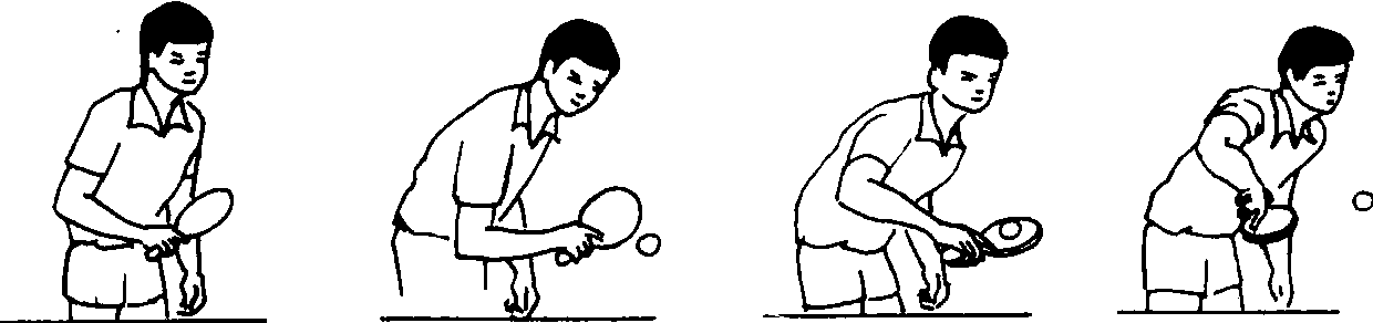 教学重点 ❶徒手搓带轴球或自抛自搓一板球练习。体会各种搓球的击球时间和拍形角度变化。 ❷搓对方发过来的下旋球练习。先练慢搓后练快搓,体会手腕配合前臂旋内转动的前送动作和击球时间。 ❸对搓练习。提高搓球动作的协调性、节奏感。 ❹正、反手搓回对方一点练习。加强正、反手搓球的落点及旋转变化。 ☚ 正手拉前冲弧圈球 削球 ☛ 搓球 搓球是用球拍搓切球托的侧下底部,使球产生向侧旋转翻滚过网。它是将近网球还击到对方近网区的击球方法之一。搓出的球越贴近网,旋转翻滚的性能越强,对方回击球就越困难,进而为自己创造进攻的机会。搓球分为正手搓球和反手搓球。正手搓球用正手握拍,球拍随着前臂伸向右前上方斜举。当球拍举至最高点时,前臂开始向外旋转,手腕稍后伸。击球时,前臂稍外旋,手腕由后伸至稍内收闪动,握拍手的食指和小指轻握拍柄,使球拍在手腕和食指的挥摆用力下,搓切来球的右下底部,使球旋转翻滚过网。反手搓球用反手握拍,前臂稍往上举,同时手腕前屈,手背约与网同高,而拍面低于网顶。搓球时,主要靠前臂的前伸外旋和手腕由内收至外展的合力,搓出球的右侧后底部,使球侧旋滚动过网。(见图2—3—29)