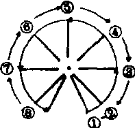2.动作(以8拍为一动作循环): 单数组:1~4拍1号从预备姿势开始,两臂按顺时针方向做匀速绕至左侧下道具触地。2~8号也从预备姿势开始,两臂先按逆时针方向匀速绕至右侧下经道具触地后再按顺时针方向绕。5~8拍动作同1~4拍组,方向相反。 双数组:1~4拍1号从预备姿势开始,两臂按逆时针方向匀速绕至右侧下道具触地。2~8号也从预备姿势开始,两臂先按顺时针方向匀速绕至左侧下经道具触地后再按逆时针方向绕。5~8拍动作同1~4拍,但方向相反。在做动作时两臂1拍绕90°,但动作要连续不可停顿,身体随臂的高低做起伏动作。此动作反复进行即可形成摆龙。